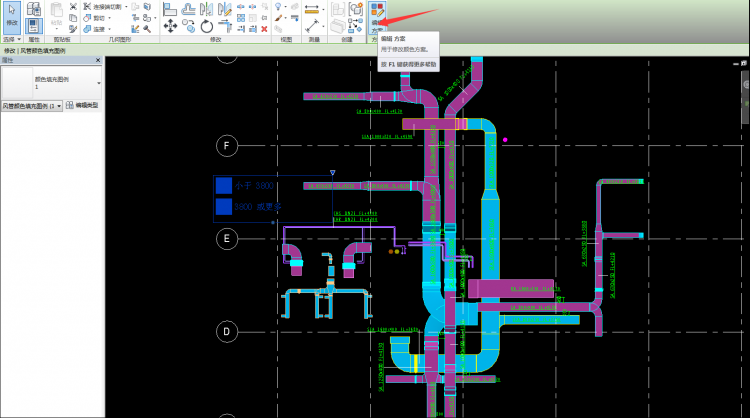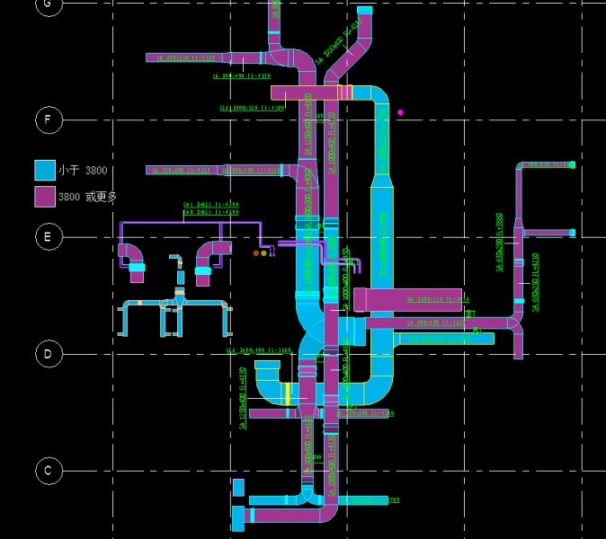 6、凈高檢查完成,小于3800是藍(lán)色風(fēng)管,大于3800是紫色分管,如圖所示。