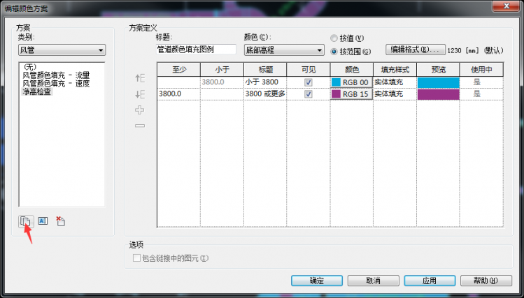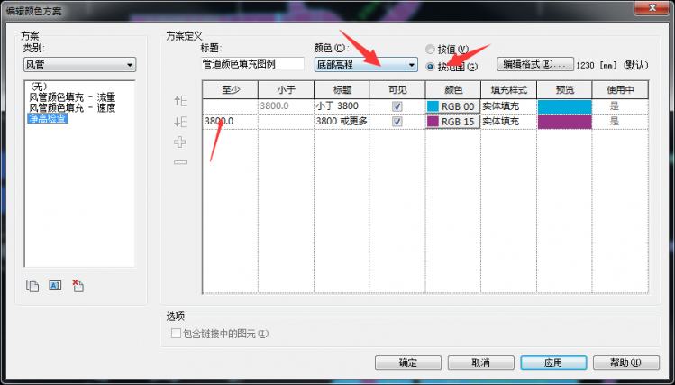 5、在方案設(shè)定屬性窗口中,“顏色”選項(xiàng)卡選擇“底部高程”,并選擇“按范圍”,設(shè)置設(shè)計(jì)所要求的凈高值(此處以3800為例),圖里顏色可根據(jù)個(gè)人需要修改,并點(diǎn)擊確定,如圖所示。