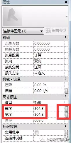 (2)選擇連接件,在“屬性”對話框中將高度與寬度分別關聯“風管高度”、“風管寬度”。