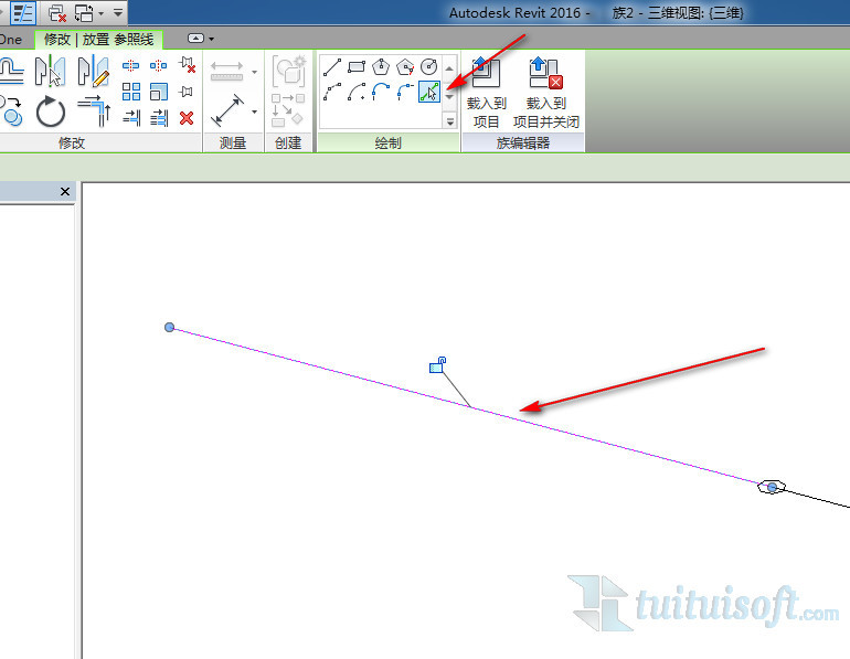 2、設置參照平面為工作平面并轉到三維視圖中,在創建選項卡中選擇參照線,用拾取線的方法拾取剛才繪制的參照平面。