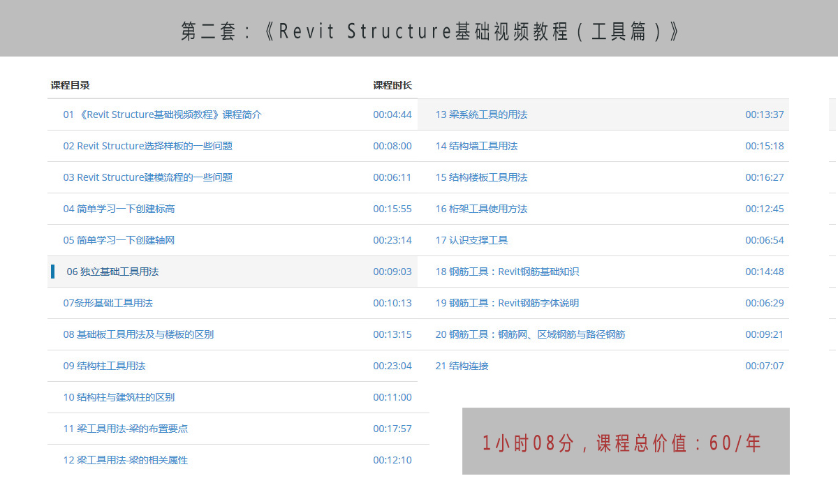 《Revit Structure基礎視頻教程(工具篇)》 課程原價:60元/年,課程時長:01:08:22